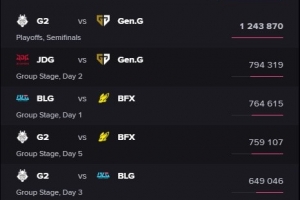 體育資訊3月22日訊 全球先鋒賽G2半決賽橫掃GEN,據Esports Charts統計,本場賽事收視率破百萬,達到124萬人次。