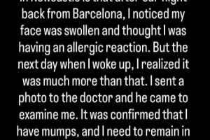 “我把照片發給醫生,他過來對我進行了檢查。結果證實我患有腮腺炎,需要隔離5天,并在更長時間內停止體力活動。我現在專注于康復,爭取盡快恢復到100%的狀態。”