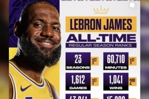長河~詹姆斯常規賽出戰賽季&時間&場次&得分&命中數 皆為歷史第一