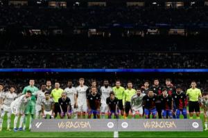 皇馬官推曬出賽前反種族歧視活動的合影,并配文:“團(tuán)結(jié)起來反對種族歧視。”