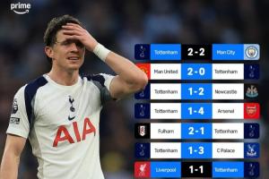 近8場英超聯賽中,熱刺僅在對陣曼城和利物浦的比賽中拿到分數,其它六場比賽全部輸球。