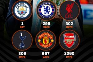 英超六強上次贏得重要獎杯至今的天數(未計入社區盾):