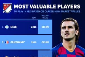 據德轉統計,格列茲曼成為巔峰身價第二高的美職聯球星,他的巔峰身價是2018年時的1.5億歐,僅次于梅西的1.8億歐。
