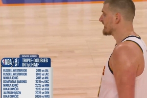 此役上半場,約基奇拿到15分11籃板9助攻的數(shù)據(jù),差1次助攻錯失半場三雙。