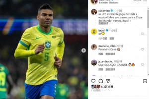 卡塞米羅社媒曬出比賽照片,寫道:“全隊都表現(xiàn)出色,向世界杯又邁進一步!加油巴西!”