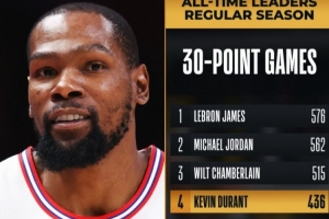 據統計,這是杜蘭特生涯第436場單場30+,超越卡爾·馬龍,上升至NBA歷史第四位,僅次于詹姆斯、喬丹和張伯倫。