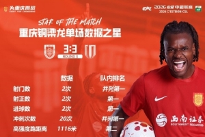 體育資訊3月26日訊 中超第3輪,重慶銅梁龍3-3戰(zhàn)平成都蓉城,據(jù)銅梁龍官方統(tǒng)計(jì),迪馬塔和吳宇曦成為本輪隊(duì)內(nèi)關(guān)鍵球員。