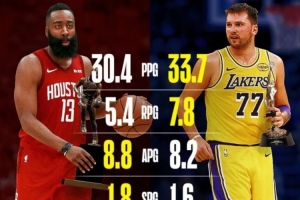 東契奇本賽季場均33.7分7.8籃板8.2助攻1.6搶斷,投籃命中率48%,三分命中率37%
