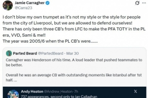 緊接著球迷Parted Beard發文反駁Heaton:“卡拉格就是他那個時代的亨德森。一個嗓門大的領袖,會推著隊友變得更好。但總體來說他只是個平庸的中衛,高光時刻只有伊斯坦布爾之夜半場后的大逆轉……”