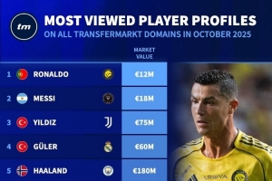 體育資訊11月2日訊 德國轉會市場列出了10月份球員頁面瀏覽量排名,C羅居首,梅西、伊爾迪茲二三位。