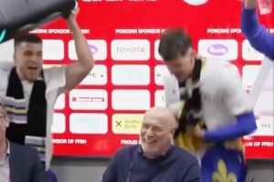 波黑主帥巴巴雷茨出席賽后發(fā)布會(huì),波黑球員帶著音響闖入發(fā)布會(huì)現(xiàn)場(chǎng),慶祝球隊(duì)晉級(jí)世界杯。