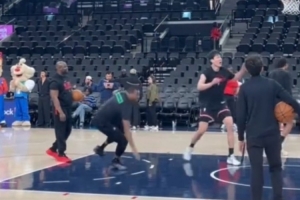 體育資訊4月1日訊 NBA常規(guī)賽,開拓者卡位戰(zhàn)客場114-104擊敗快船。賽前有鏡頭捕捉到楊瀚森在熱身時撞倒了黑人助教。