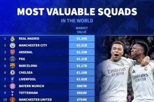 體育資訊04月01日訊 德轉(zhuǎn)統(tǒng)計了目前全球身價最高的二十支球隊,其中,皇馬以13.4億歐位居榜首,曼城、阿森納分列二三,前20中有12支英超球隊。