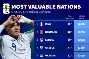 體育資訊4月2日訊 德國轉(zhuǎn)會市場列出了無緣世界杯球隊(duì)身價(jià)排名,意大利8.34億歐居首,丹麥、塞爾維亞二三位。
