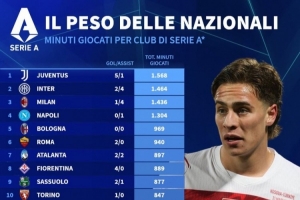 體育資訊4月2日訊 德國轉(zhuǎn)會(huì)市場統(tǒng)計(jì)了意甲各隊(duì)球員在這個(gè)國際比賽日的出場總時(shí)間,并列出榜單,尤文、國米、米蘭前三。
