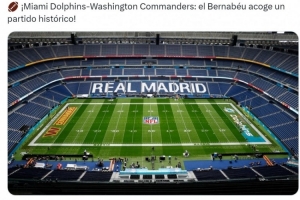 皇馬官方社媒曬出伯納烏球場準備就緒的照片,配文:“邁阿密海豚vs華盛頓指揮官,伯納烏球場將迎來一場歷史性的比賽。”