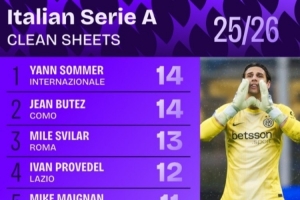 體育資訊4月3日訊 足球數據網站Squawka統計本賽季意甲門將零封榜,索默14次第一,邁尼昂第五,迪格雷戈里奧第七。