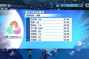 在今晚進行的全運會游泳男子100米蝶泳決賽中,天津隊王長浩51.40秒獲得金牌,山東隊徐放51.46秒獲得銀牌,廣東隊陳俊兒52.32秒獲得銅牌。