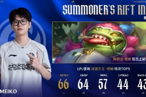 LPL賽事使用塔姆場次最多的選手TOP5如下,其中Meiko以66次使用位列第一;