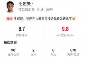 體育資訊4月4日訊 拜仁在本輪德甲3-2逆轉弗賴堡,比朔夫本場數據如下: