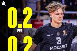 體育資訊11月17日訊 明年的熱門新秀穆里寧截止目前為止,在歐籃聯只出場4次,場均出場時間僅為1分55秒,而他的場均數據可以忽略不計,4場比賽合計就得到1分,場均為0.25分,也沒有籃板、助攻進賬。