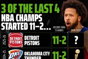 體育資訊11月17日訊 活塞媒體Pistons Talk曬出了一個驚人的巧合數據,近4年的NBA總冠軍中,有三支球隊在當賽季開局都是11勝2負,唯有22-23賽季的掘金例外。