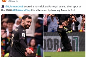 曼聯官推也曬出B費慶祝進球照片,配文寫道:“在葡萄牙9-1擊敗亞美尼亞的比賽中B費上演帽子戲法,葡萄牙也鎖定世界杯參賽名額。”