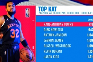 在今天的戰勝老鷹的比賽中,尼克斯中鋒唐斯達成生涯18000分8000籃板1000三分的成就,是歷史第七個達成這一成就的球員。