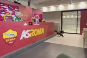 《羅馬體育報》曬出的視頻顯示,當加斯佩里尼回答記者提問時,一只貓闖進了新聞發布廳。這只貓咪恰好就在加斯佩里尼發言的講臺附近開始喵喵叫,教練關于本賽季陣容可能調整的論述被貓叫聲打斷。