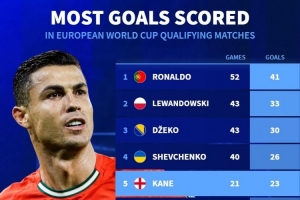 體育資訊11月17日訊 德國轉(zhuǎn)會市場列出了歐洲世預(yù)賽歷史射手榜,C羅41球居首,萊萬33球次席,哈蘭德21球排在第7位。