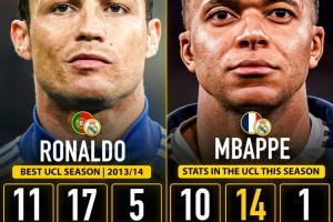 姆巴佩本賽季歐冠出戰(zhàn)10場比賽已經打進14球,高居射手榜第一。而在歐冠單賽季總進球排行榜上,姆巴佩距離C羅在2013/14賽季的17球紀錄還有3球之差。
