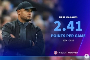 體育資訊4月8日訊 在歐冠淘汰賽首回合,拜仁2-1擊敗皇馬,孔帕尼也迎來(lái)執(zhí)教拜仁100場(chǎng)里程碑。德轉(zhuǎn)盤(pán)點(diǎn)了拜仁多位名帥在前100場(chǎng)比賽場(chǎng)均積分情況,具體如下: