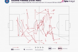 數據統計顯示,維蒂尼亞半場便完成了65次傳球,而利物浦全隊共計僅82次。