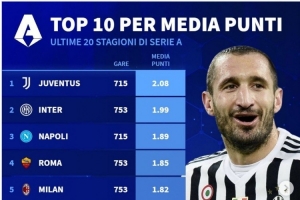 體育資訊4月9日訊 德國轉會市場統計了過去20個賽季意甲球隊的聯賽場均積分,以及總積分,并列出榜單。