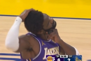 詹姆斯釘板大帽太大力捂著手掌被換下場在替補席冰敷處理