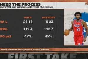 恩比德缺陣時,76人19勝23負,場均112.7分,全隊投籃命中率45%。