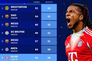 體育資訊4月11日訊 拜仁在歐冠客場2-1擊敗皇馬,奧利塞送出助攻。《轉會市場》統計顯示他已經躋身新世紀五大聯賽球員單賽季各項賽事助攻榜第7位。