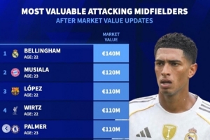 體育資訊4月11日訊 《轉會市場》統計了前腰位置球員身價情況,貝林厄姆力壓穆西亞拉居首。