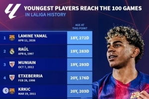 德轉(zhuǎn)列西甲歷史最年輕百場榜: