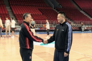 上午的踩場(chǎng)訓(xùn)練中,場(chǎng)邊發(fā)生有趣的一幕,北京男籃主帥許利民和上海男籃主帥盧偉寒暄,他說道:“你們現(xiàn)在太猛了,拿第一了啊。”