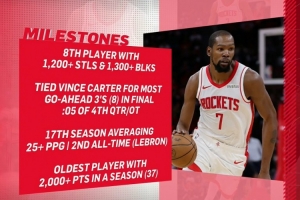 本賽季,杜蘭特場均能得到26分5.5籃板4.8助攻0.8搶斷0.9蓋帽,他還達成了以下成就: