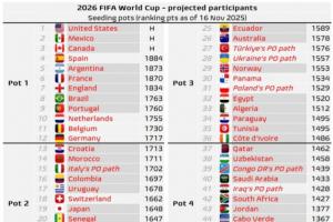 體育資訊11月17日訊 世預(yù)賽激戰(zhàn)正酣,目前世界杯48支參賽隊(duì)已確定32席,數(shù)據(jù)機(jī)構(gòu)Football Meets Data給出了最新的世界杯分檔預(yù)測(cè)。