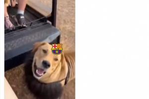 視頻中,一只獅子被加上了巴薩隊(duì)徽,跑到帶著馬競(jìng)隊(duì)徽的人身前,被薅下頭套,下面是條狗。