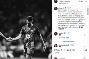 埃里克·加西亞社媒寫道:“歐冠夢(mèng)想與我們擦肩而過,這支球隊(duì)值得擁有更多,我們已經(jīng)拼盡全力,一度觸手可及,但最終未能如愿?!?/p>