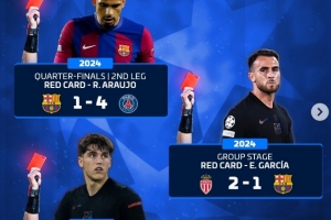體育資訊4月15日訊 在歐冠淘汰賽次回合,巴薩2-1擊敗馬競,加西亞吃到紅牌,這是巴薩近3個賽季在歐冠吃到的第6張紅牌,以下為具體情況: