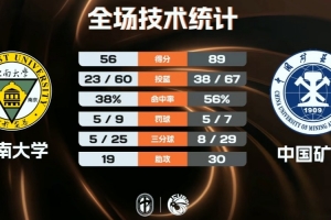 末節(jié)中國礦大延續(xù)狀態(tài),他們開局三個回合全部達成上來就是一波6-1的攻勢繼續(xù)擴大領先,隨后東南大學雖然進攻端反撲,但場面優(yōu)勢不大且巨大分差之下難以制造威脅,末段寧吉桐命中三分穩(wěn)穩(wěn)保持大比分優(yōu)勢。最終,中國礦大89-56輕取東南大學進入八強。