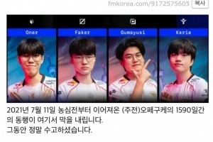 體育資訊11月17日訊 今日T1官宣Gumayusi正式離隊,而韓網有網友發帖自從2021年7月11號開始,OFGK組合已經一起走過了1590天。
