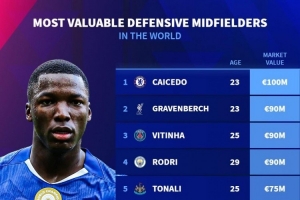 體育資訊11月2日訊 德國轉會市場列出了防守型中場身價排名,凱塞多以1億歐居首。