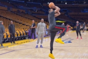 賽前,杜蘭特進行熱身,看來膝蓋傷勢并不嚴重。