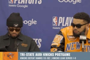 體育資訊4月19日訊 NBA季后賽東部首輪G1,尼克斯113-102戰勝老鷹。賽后,布倫森和唐斯接受媒體采訪,以下為采訪全文。